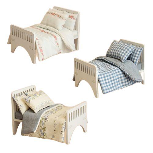 Material: Crafted from wood for the bed frame, paired with printed fabric bedding in charming patterns.